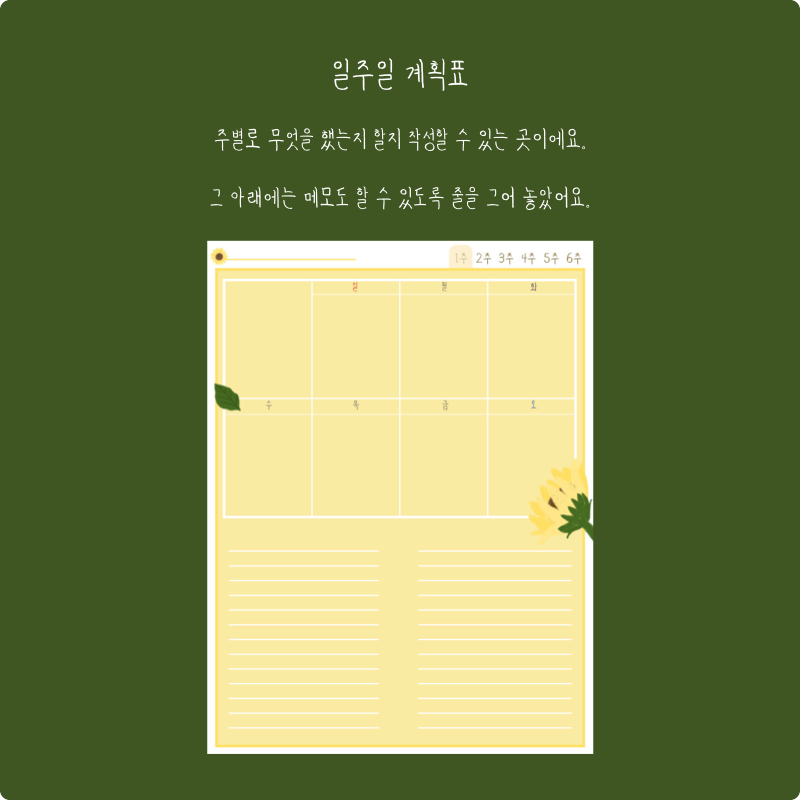 동그란 시간표, 일주일 계획표, 하루계획표, 그림일기장, 모눈 노트, 줄노트로 구성되어 있어요! 필요한 노트를 골라쓰는 재미를 느껴보세요~